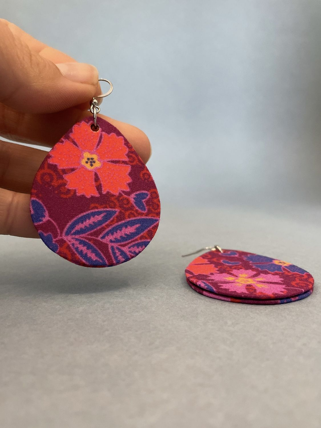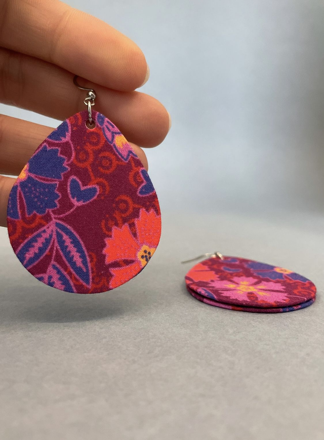 Boucles d'oreilles en carton et tissu coton, en forme de grandes gouttes et mesurant 5 cm de hauteur et 4 cm de largeur.