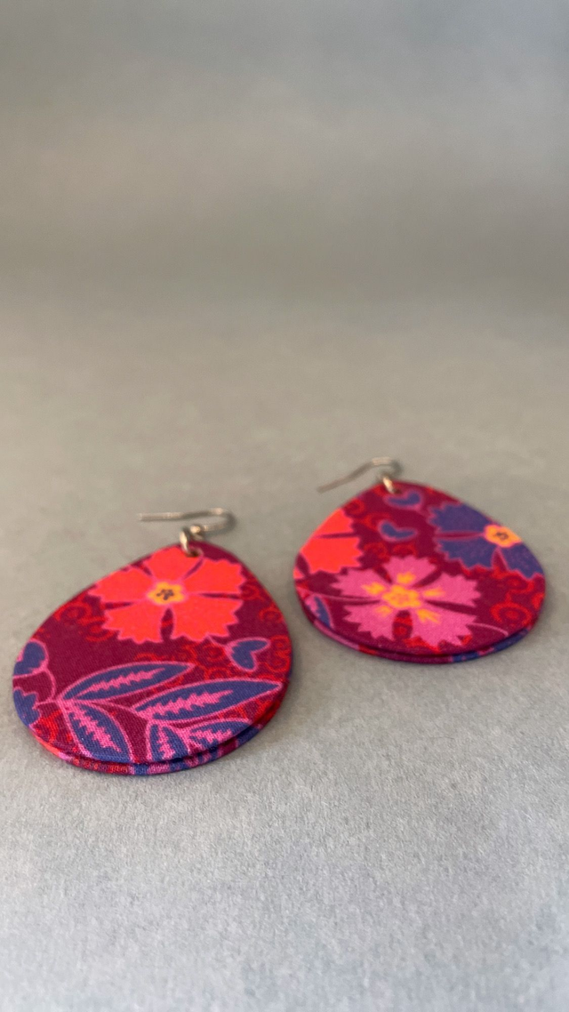 Boucles d'oreilles carton et tissu forme grandes gouttes, collection " indie rouge " - fond rouge et motifs fleuris tons bleu et rose