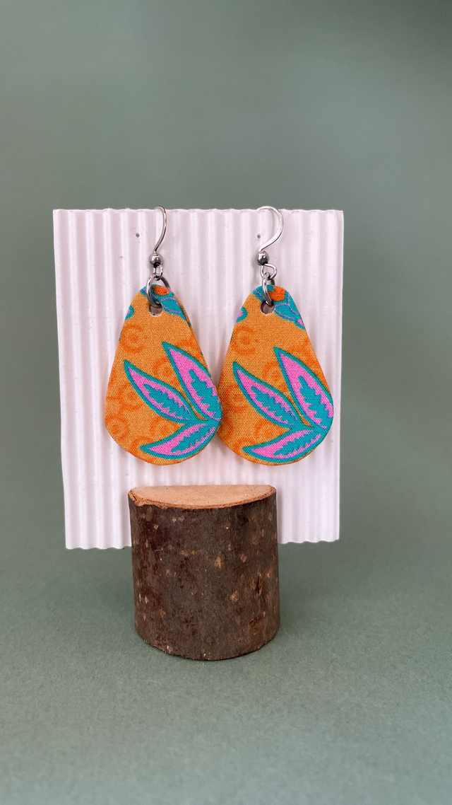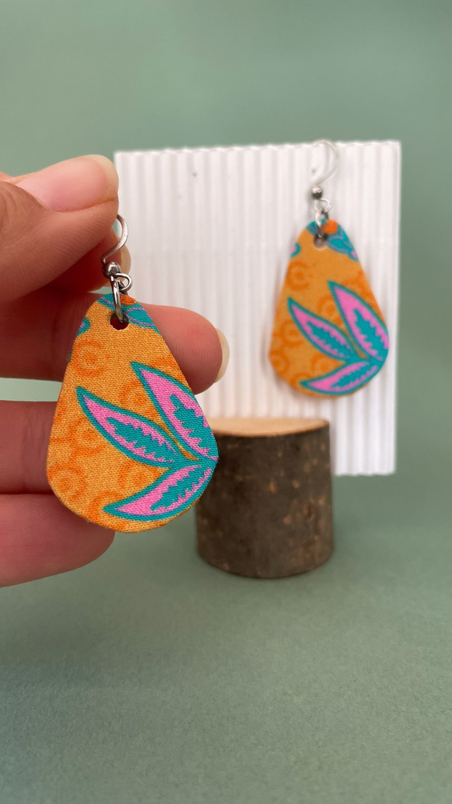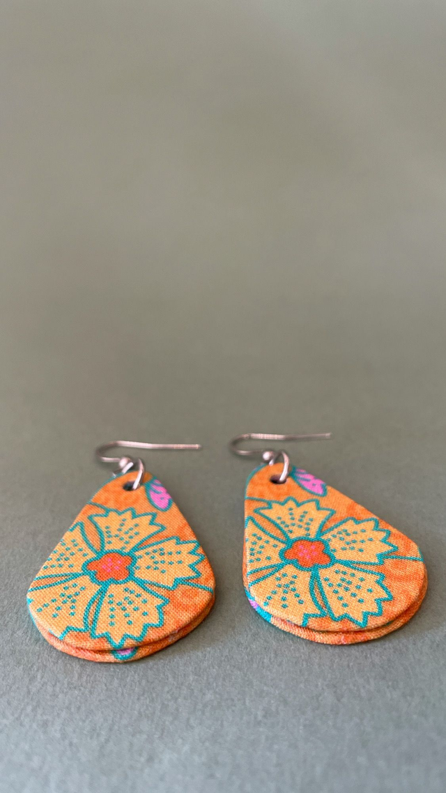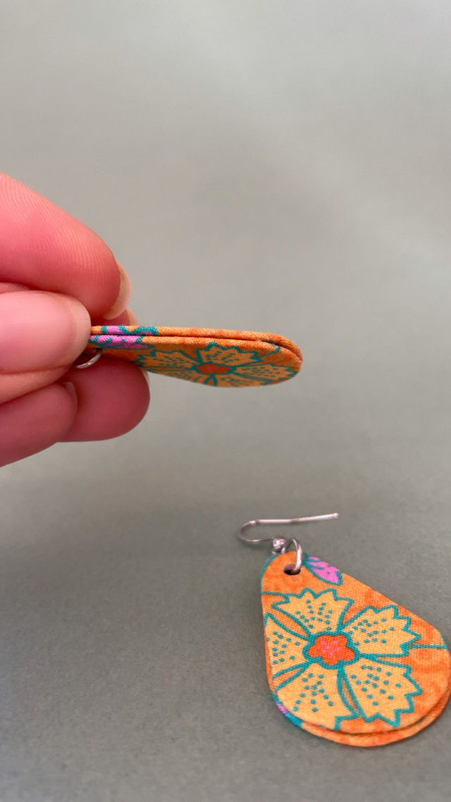 Boucles d'oreilles carton et tissu forme petites gouttes, collection " indie mandarine " - fond orangé et motifs fleuris tons jaune, rose et turquoise
