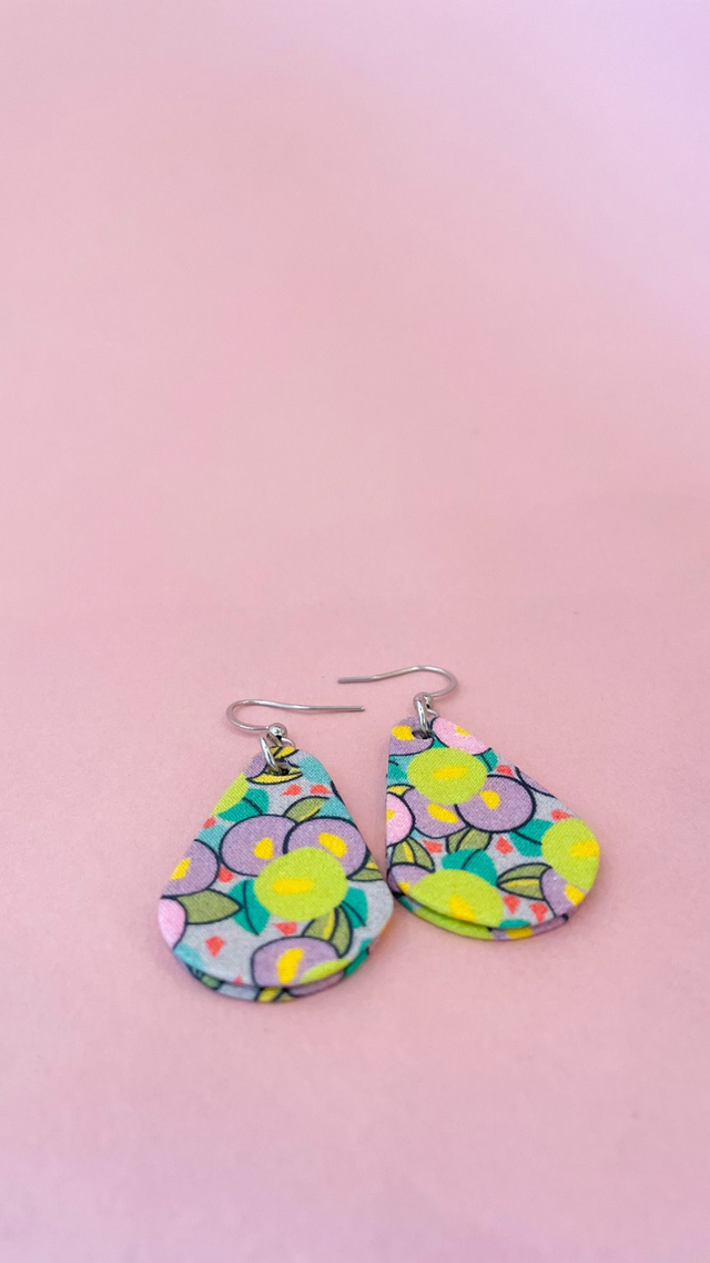 Boucles d'oreilles carton et tissu forme petites gouttes, collection " rose pop " - fond mauve et motifs fleuris rose, vert et violet