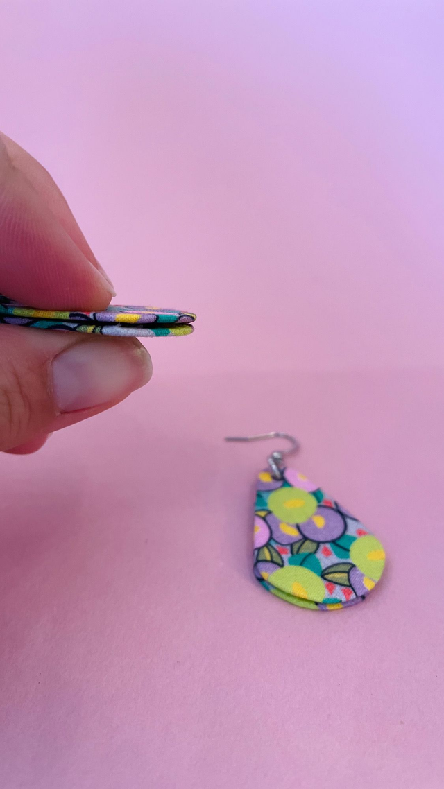 Boucles d'oreilles en carton et tissu coton, de forme petite goutte et mesurant 3,5 cm de hauteur et 2,5 cm de largeur.