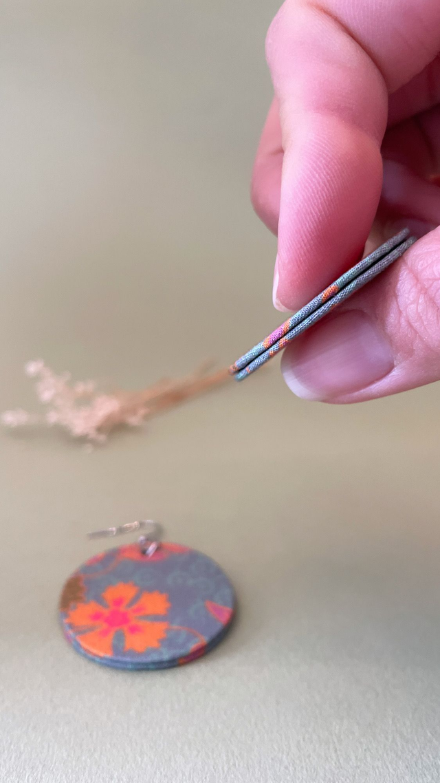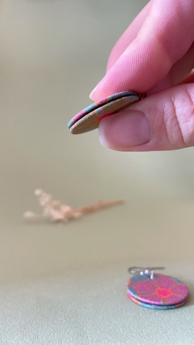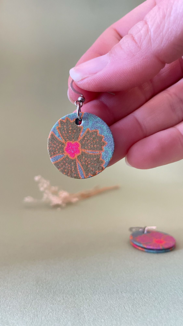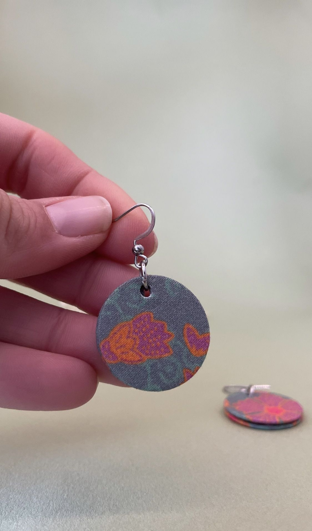 Boucles d'oreilles carton et tissu forme petites rondes, collection " indie ardoise " - fond bleu/gris et motifs fleuris kaki, rose et orange