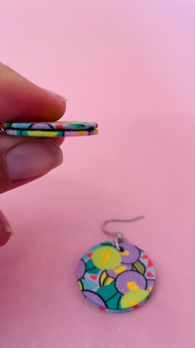 Boucles d'oreilles en carton et tissu coton, de forme ronde et mesurant 2,5 cm de diamètre.