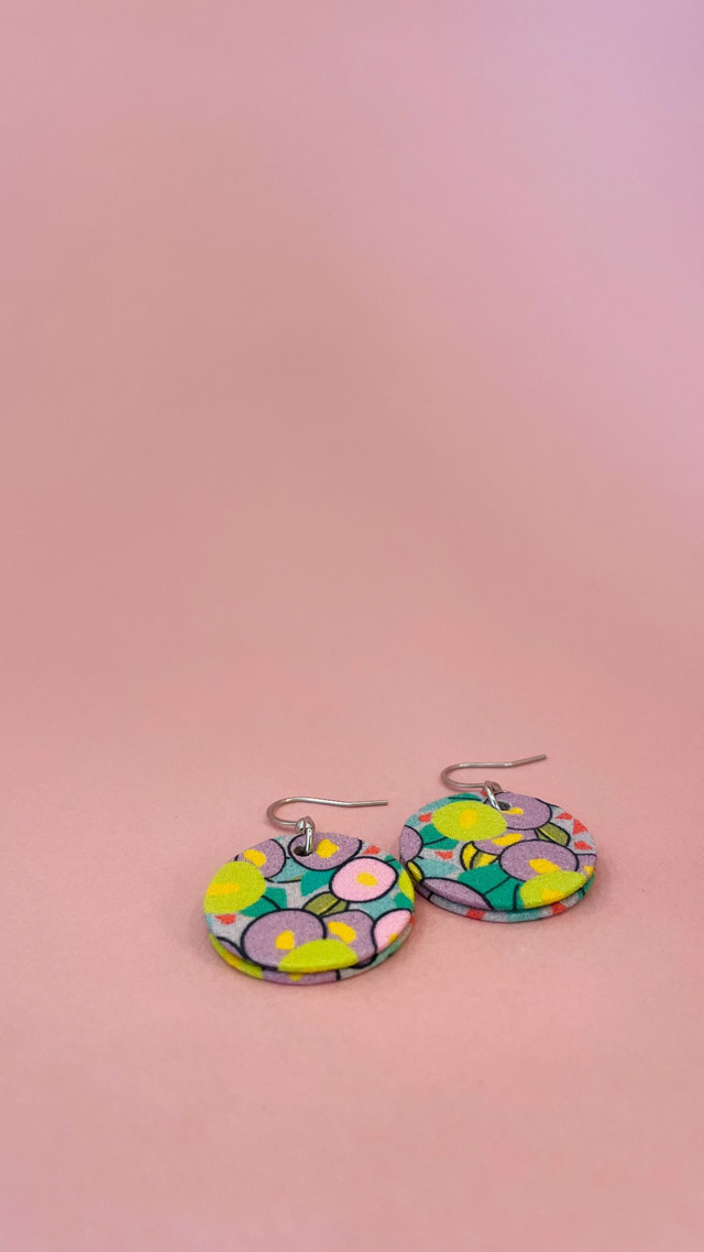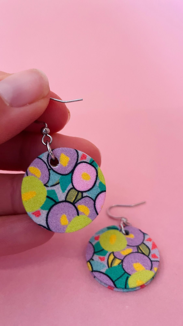 Boucles d'oreilles carton et tissu forme petites rondes, collection " rose pop " - fond mauve et motifs fleuris rose, vert et violet