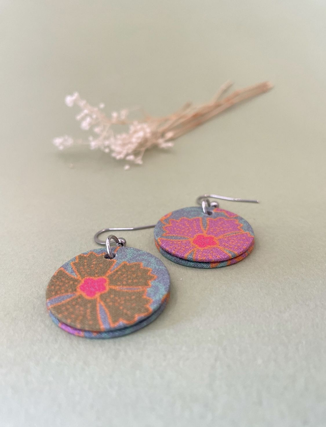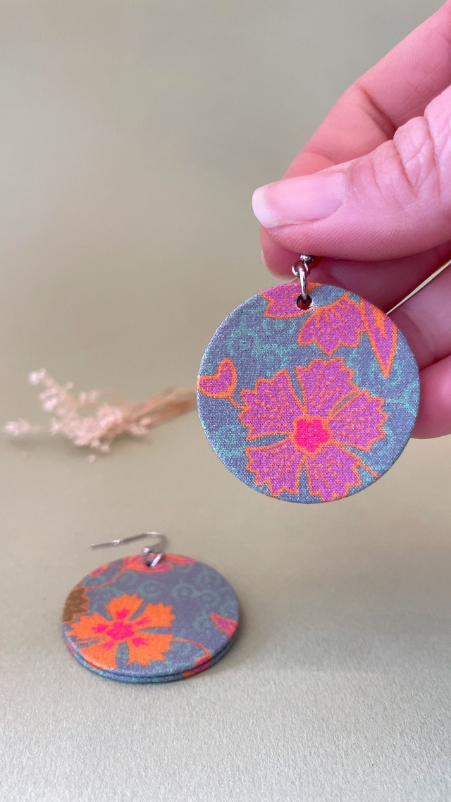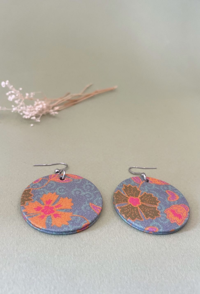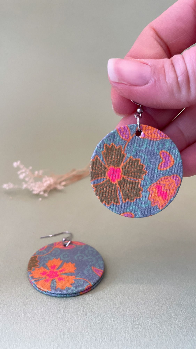 Boucles d'oreilles carton et tissu forme ronde, collection " indie ardoise " - fond bleu/gris et motifs fleuris kaki, rose et orange