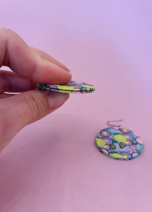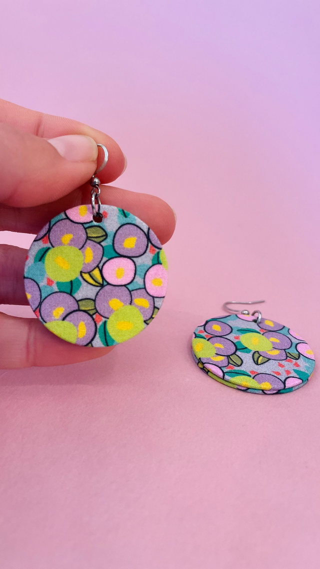 Boucles d'oreilles carton et tissu forme ronde, collection " rose pop " - fond mauve et motifs fleuris rose, vert et violet