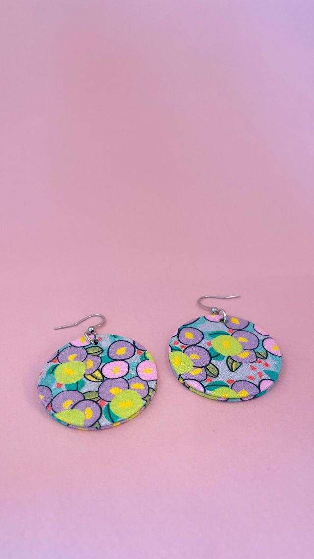 Boucles d'oreilles en carton et tissu coton, de forme ronde et mesurant 4 cm de diamètre.