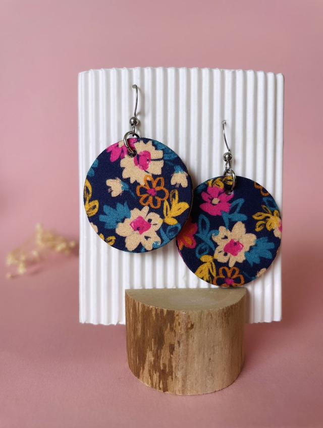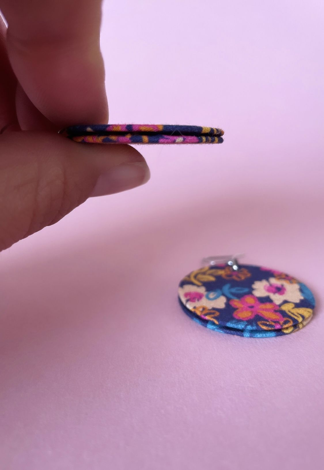 Boucles d'oreilles en carton et tissu coton oeko tex, de forme ronde et mesurant 3,5 cm de diamètre.