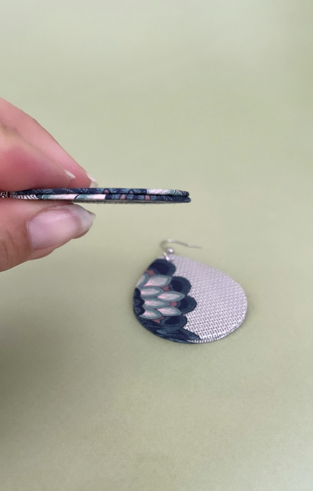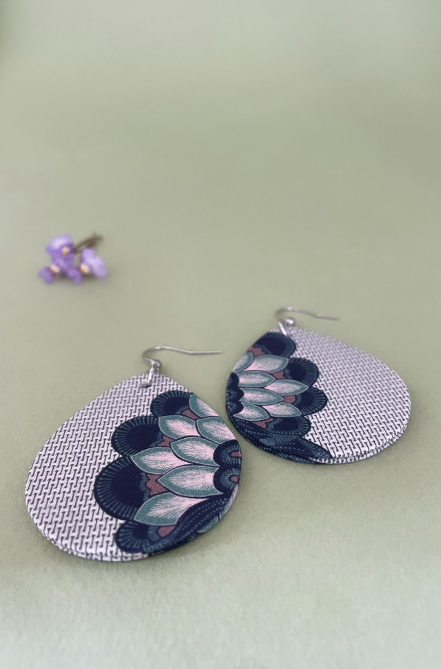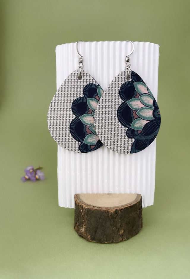 Boucles d'oreilles en carton et tissu coton oeko tex, en forme de grandes gouttes et mesurant 5 cm de hauteur et 4 cm de largeur.
