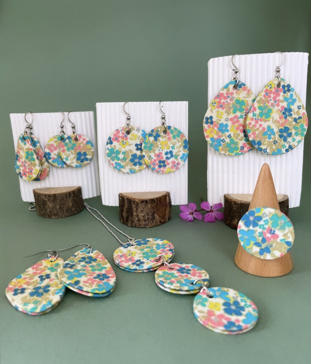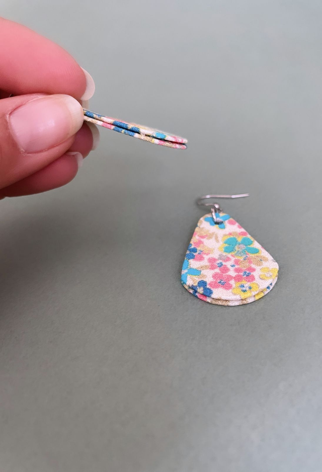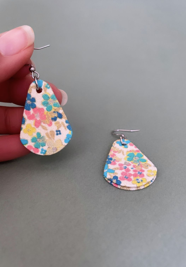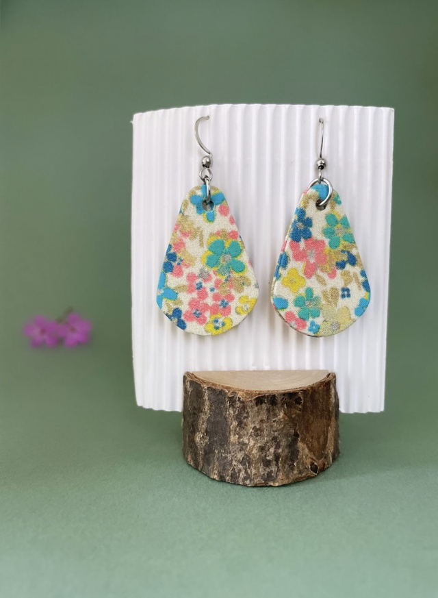 Boucles d'oreilles carton et tissu imprimé forme peites gouttes, collection « pâquerette vintage » - tons blanc, rose, bleu, vert et doré.