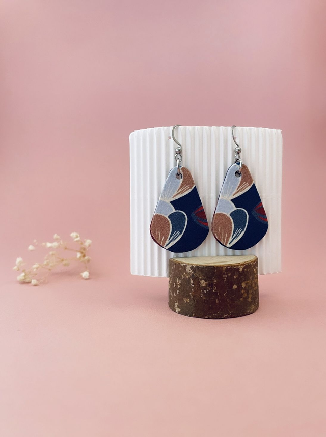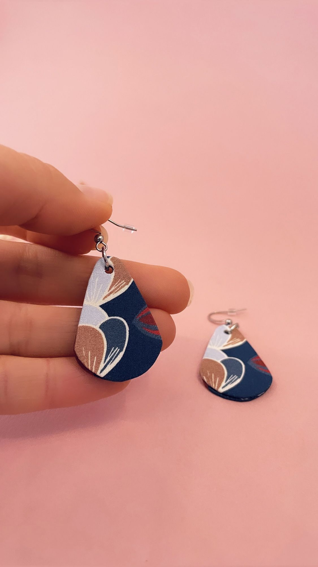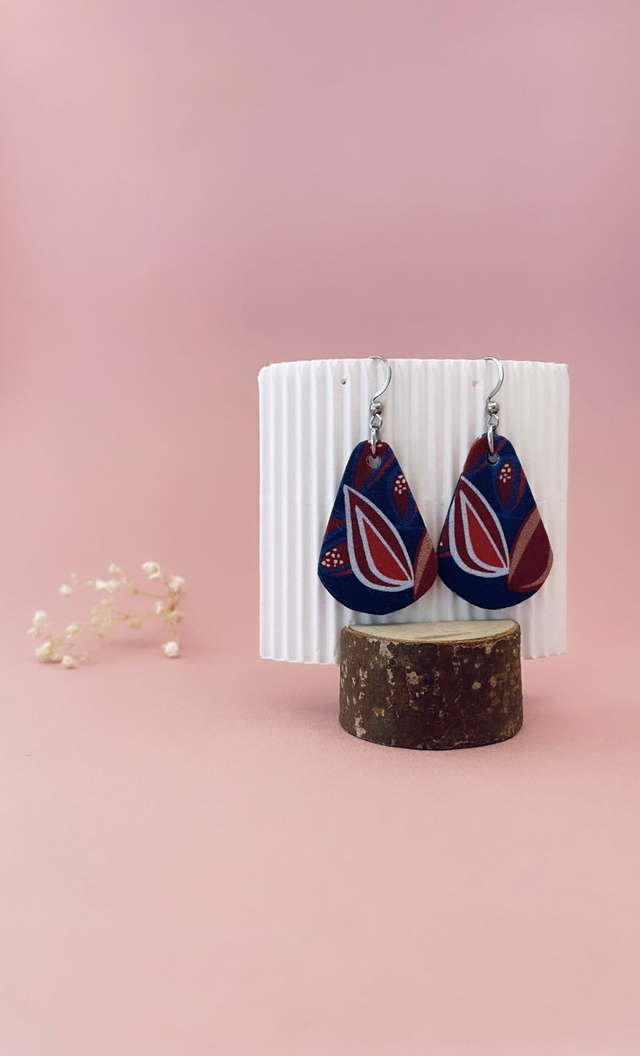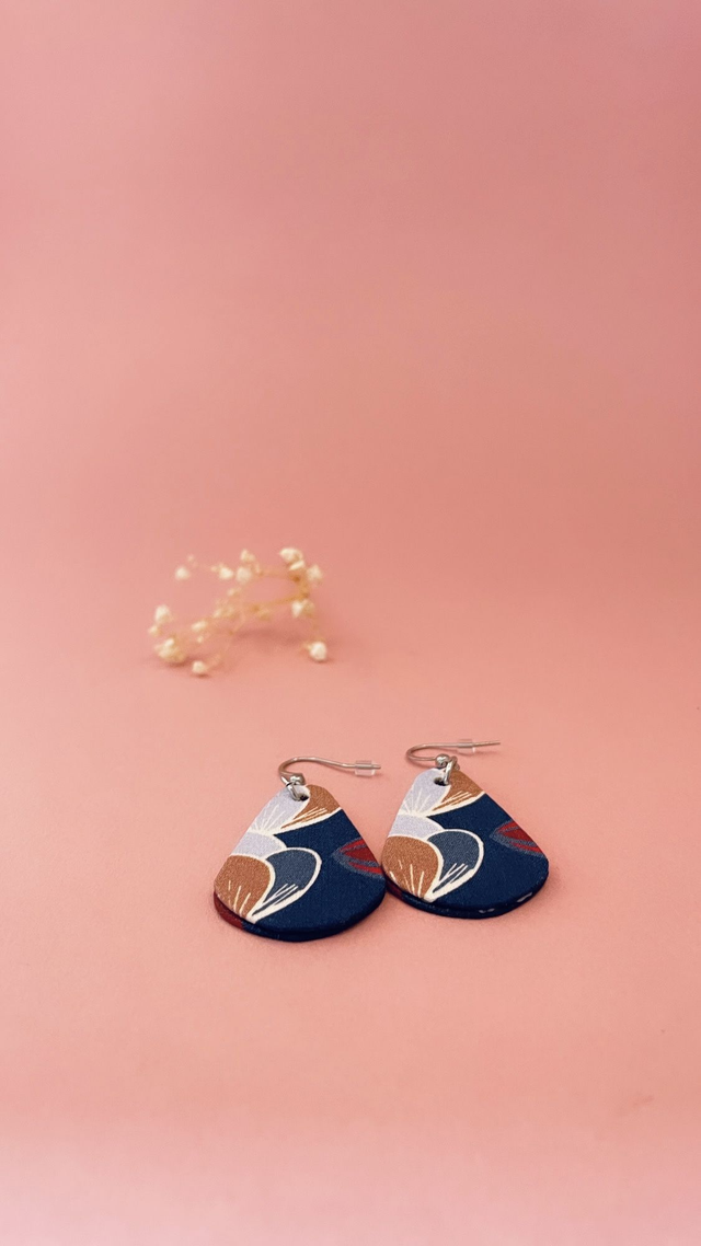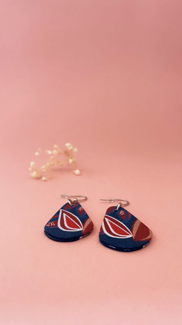 Boucles d'oreilles carton et tissu imprimé forme petites gouttes, collection «la nuit fleurie » - tons bleus, bordeaux, beiges.