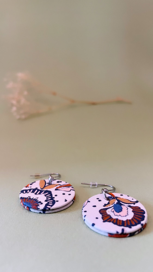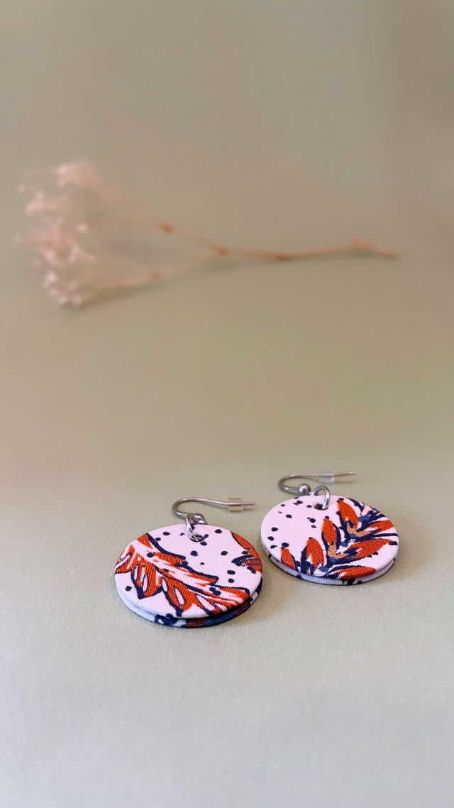 Boucles d'oreilles en carton et tissu coton oeko tex, de forme ronde et mesurant 2,5 cm de diamètre.