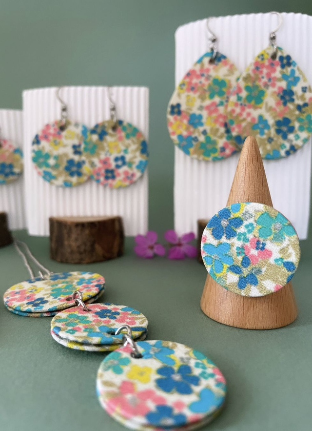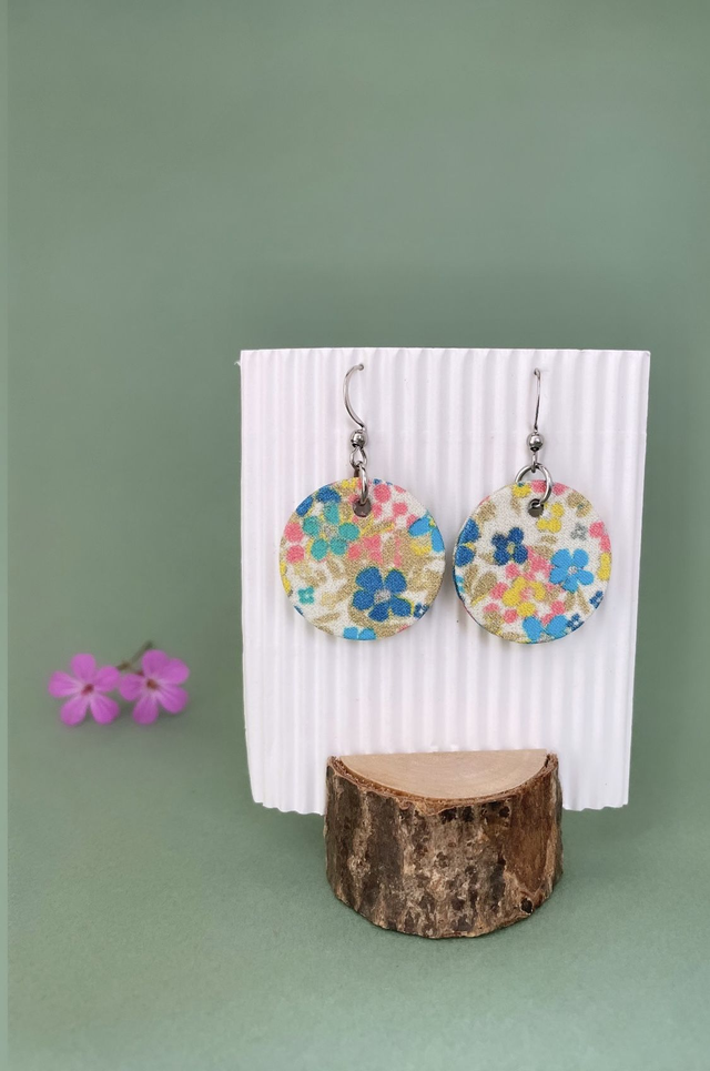 Boucles d'oreilles carton et tissu imprimé forme petites rondes, collection « pâquerette vintage » - tons blanc, rose, bleu, vert et doré.