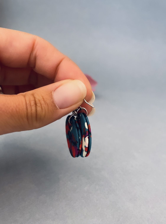 Boucles d'oreilles en carton et tissu coton oeko tex, de forme ronde et mesurant 2,5 cm de diamètre.