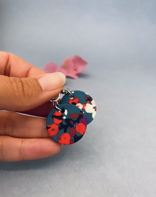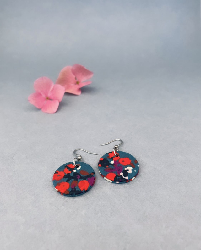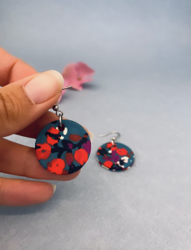 Boucles d'oreilles carton et tissu imprimé, petites rondes, collection collection "anémones", fond bleu et motifs fleuris rose, rouge, blanc.