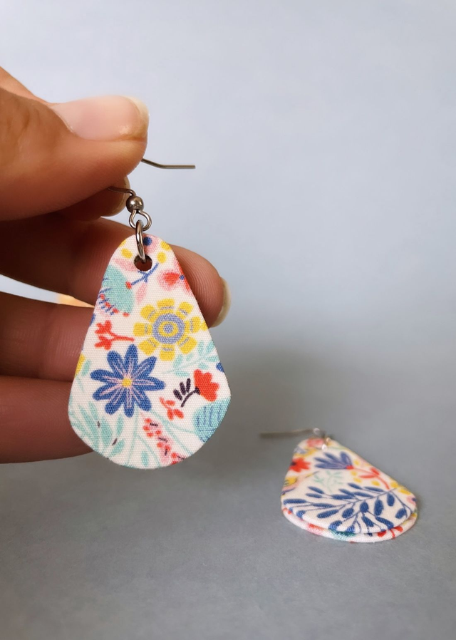 Boucles d'oreilles carton et tissu imprimé végétal forme petites gouttes, collection « champêtre » - tons blanc, bleu, rouge, jaune, vert.
