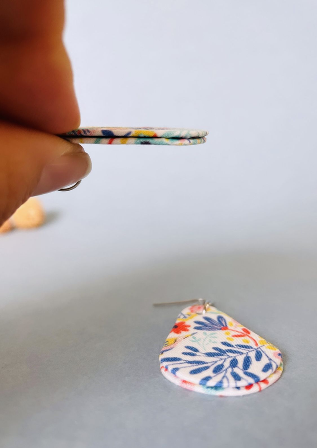 Boucles d'oreilles en carton et tissu coton oeko tex, de forme petite goutte et mesurant 3,5 cm de hauteur et 2,5 cm de largeur.
