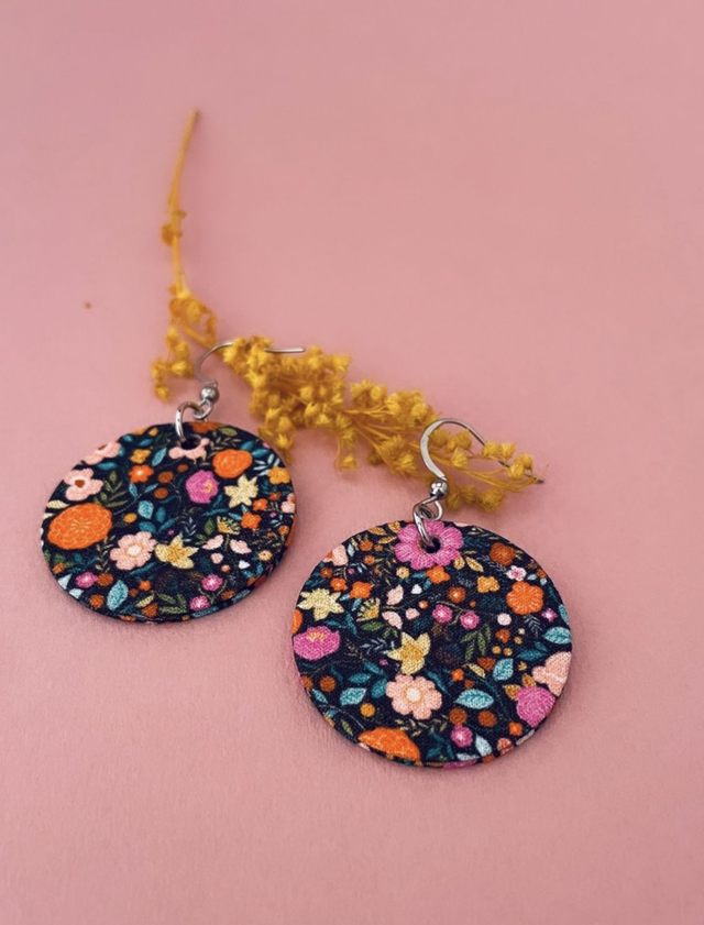Boucles d'oreilles carton et tissu, rondes, collection "1001 fleurs" - fond noir et motifs fleuris multicolores