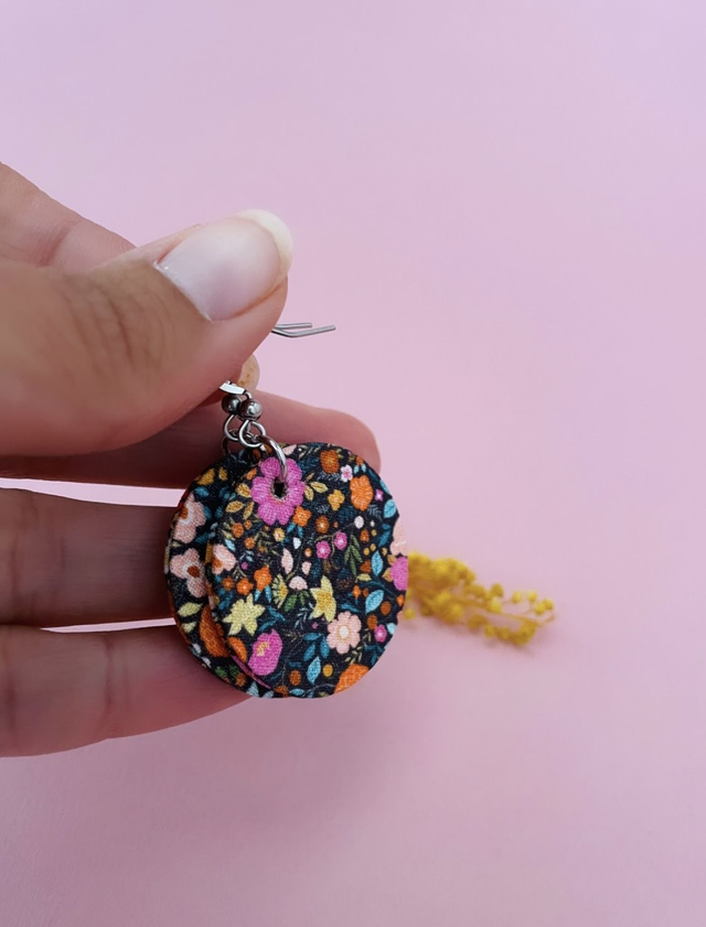 Boucles d'oreilles en carton et tissu coton oeko tex, de forme ronde et mesurant 3,5 cm de diamètre.